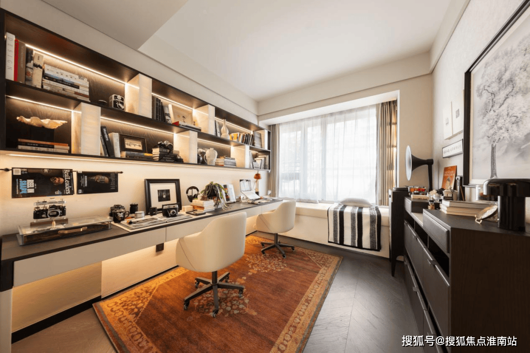 其中主卧的270°转角飘窗就有约5.7m²,通过与外立面的结合,直接做了梳妆台和储物柜,拓展了飘窗的实用性。