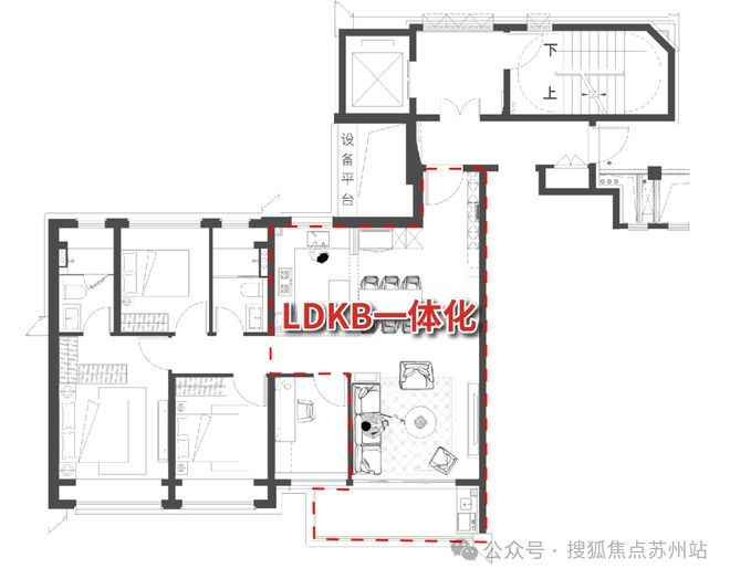 LDKB一体化的设计,将客餐厅、厨房融为一体,打破空间便捷的同时,尽可能地提升公区的空间使用率,尺度感超强,可轻松承载会客、家庭聚会、生日派对等场景。