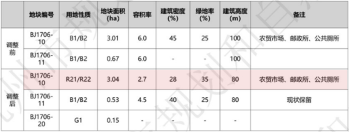包括地块面积、容积率从6.0到2.7、建筑密度从45%下降至28%,绿地率也来到从25%提升到35%,限高80米