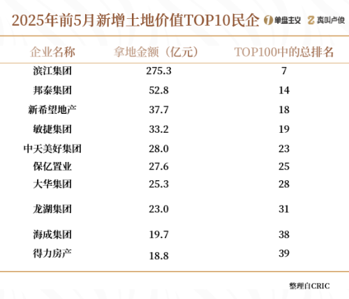 克而瑞公布的前5月房企新增货值排行榜中,拿地金额百强中有接近三成民企现身