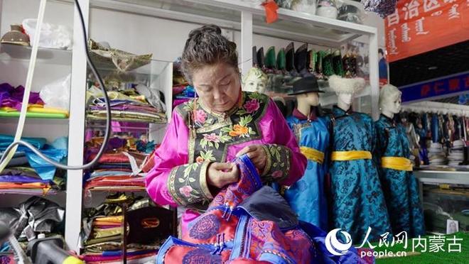 蒙古族服饰(巴林服饰)非遗代表性传承人额尔灯塔那正在缝制蒙古袍。人民网记者 张力洋摄