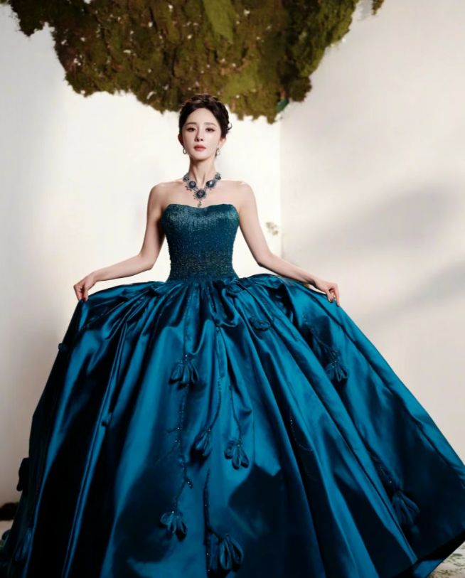 她穿了条宝蓝色的长裙,颜色特别亮眼。这种蓝色一般人很难穿好看,但杨幂穿上特别显白。裙子是抹胸款式,显得肩膀很好看,腰身也收得恰到好处。