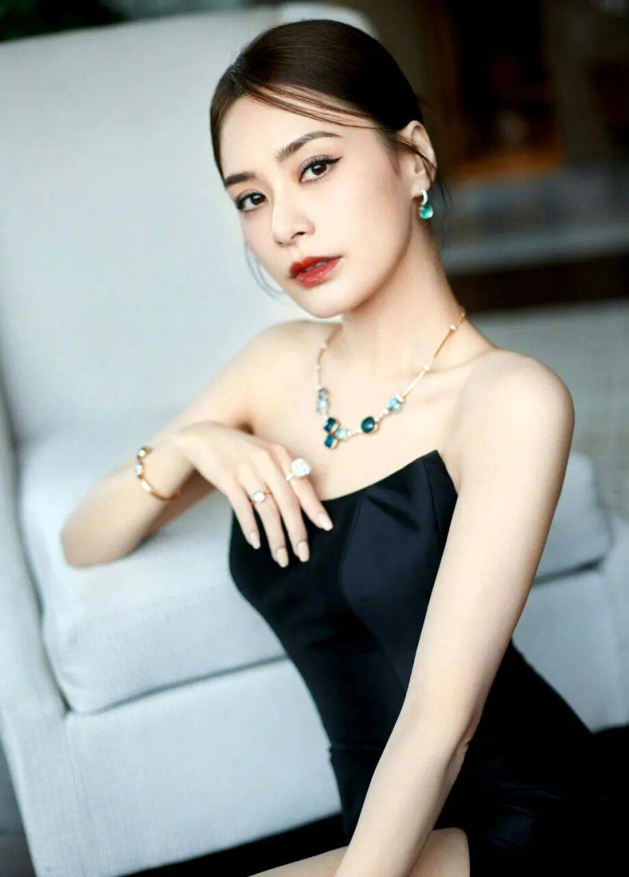 阿娇穿着黑色抹胸衣裙,脖子戴着黄金首饰,她俏脸清丽脱俗,五官精致,泪眼红唇,露出白皙的香肩,微微一笑很倾城!